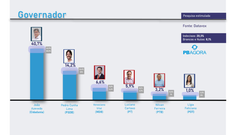 Em segundo lugar, quem surge é Pedro Cunha Lima (PSDB) com 14,2%, seguido por Veneziano Vital do Rêgo (MDB): 6,6%; Luciano Cartaxo (PT): 5,9%; Nilvan Ferreira (PTB): 3,2% e Lígia Feliciano (PDT): 1%. Indecisos: 20,3%; Branco ou nulo: 8,1%.