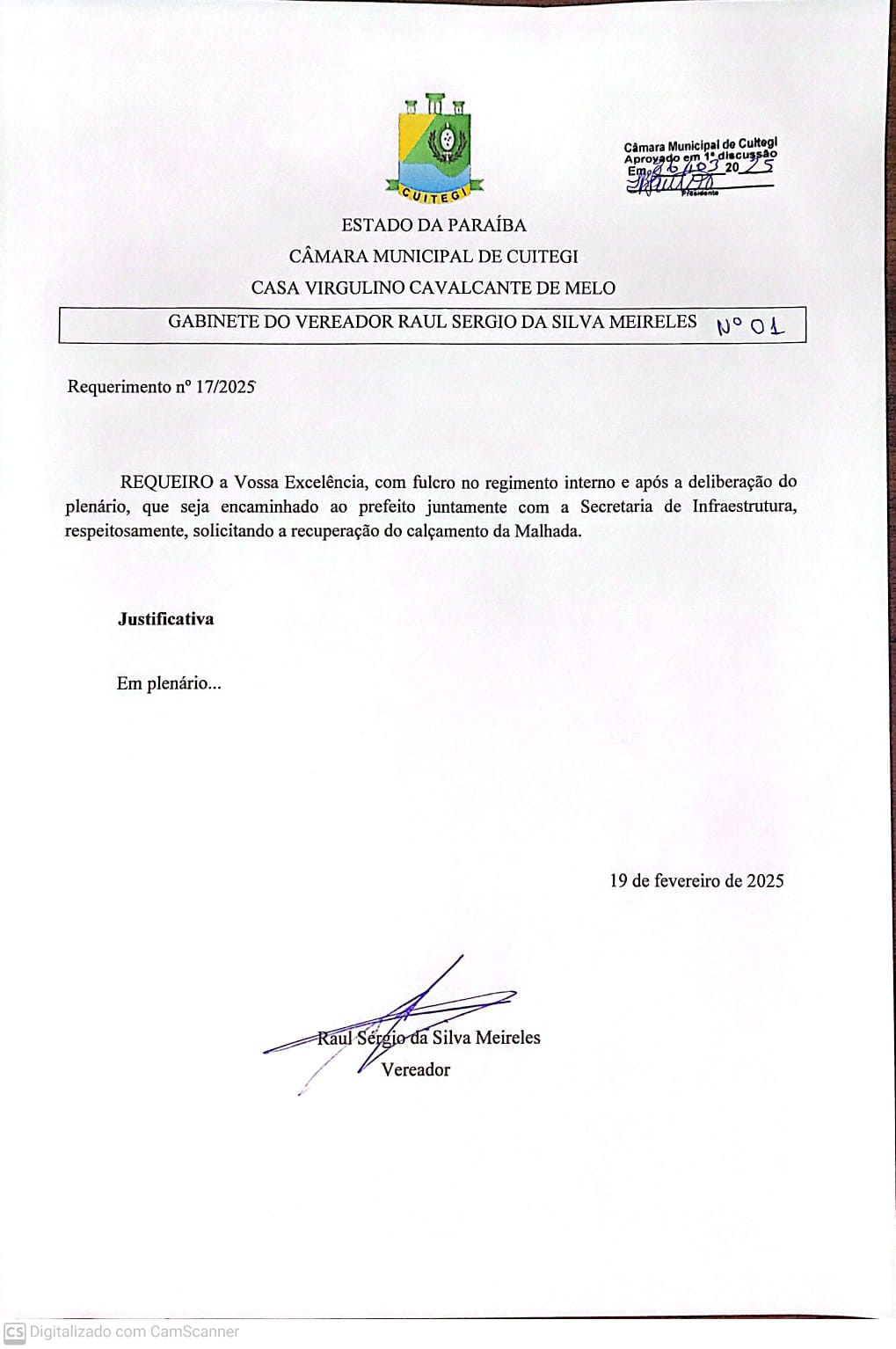 Cuitegi (PB) - A Câmara Municipal de Cuitegi aprovou, por unanimidade, cinco requerimentos de indicação do vereador Raul Meireles durante a sessão desta quarta-feira (26).